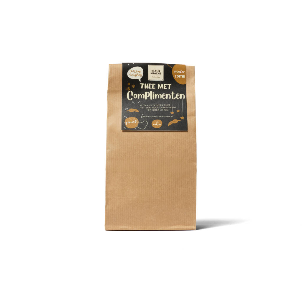 Ontdek de heerlijke complimenten thee winter editie van Kleurkracht – een thee die met zorg en liefde is samengesteld. 10 zakjes winterthee; Zoetkruidige, biologische zwarte thee. Sneeuw, regen of een stormachtige dag. Drink hem lekker in de gure Hollandse wintermaanden. Op ieder zakje een welverdient compliment. Deze thee bevat zwarte thee, kaneel, kruidnagel, citroenschil, rozenbloesem, natuurlijk aroma en is ideaal om te schenken bij speciale momenten of gewoon om jezelf te verwennen. Onze complimenten thee winter editie wordt duurzaam verpakt en is perfect als cadeau of voor dagelijks gebruik. De rijke geur en volle smaak zorgen voor een ultieme theebeleving. Probeer deze thee en laat je verrassen door de kwaliteit en het vakmanschap van Kleurkracht. Zo wordt elk kopje thee een bijzonder moment.